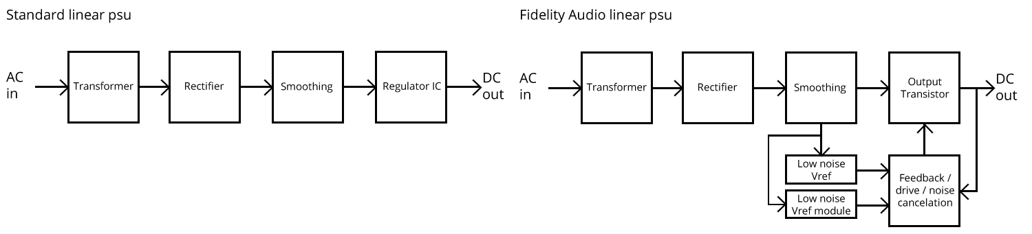 All our Power Supplies are built to the highest level and the lowest noise. We develop our own discrete low noise / noise cancellation voltage regulation with very low noise custom vref circuits. All other power supplies use standard off the shelf regulators and simple DIY style circuits.